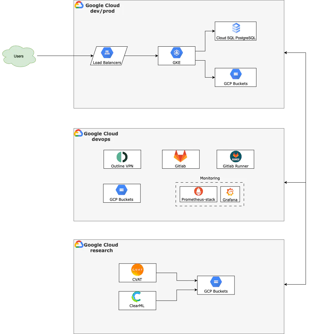 Миграция прошла поэтапно: для каждого окружения были развернуты новые проекты в GCP, настроены все необходимые сервисы и протестированы перед запуском. CI/CD был переведён в GitLab на отдельном инстансе, мониторинг и логирование — на стек Prometheus и Google Cloud Logging. Все данные и компоненты успешно перенесены, без сбоев в работе системы. Полный переход занял около одного месяца.